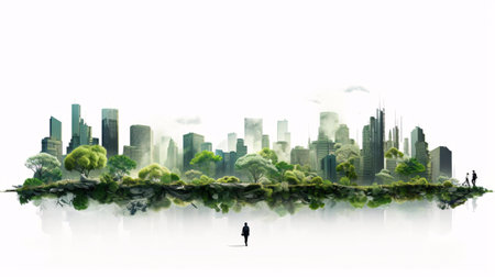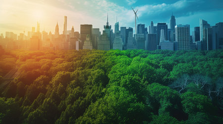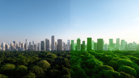 Environmental transformation City skyline evolves into sustainable green city promoting urban development. Concept Eco-Friendly Cities, Sustainable Urbanism, Green Infrastructure, Urban Development