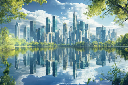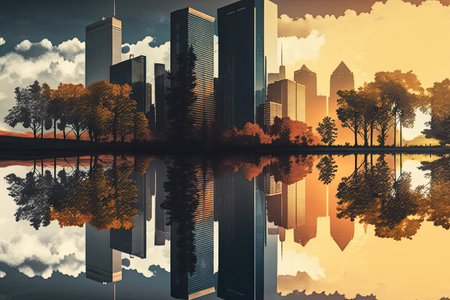 reflection of skyscrapers on the waters of a lake, created with generative ai