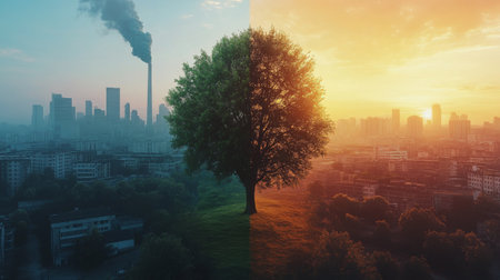 On one side, thick smoke bills from factories, showcasing industrial pollution, while on the other, a calm sunset illuminates a tree, highlighting the beauty of nature.