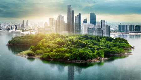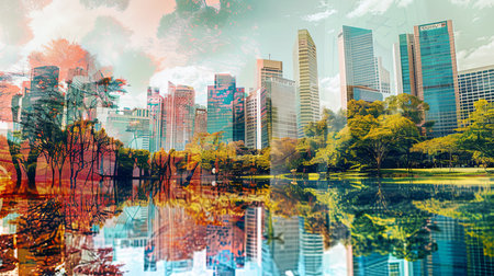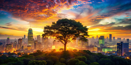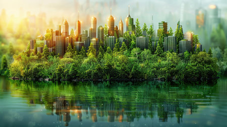A vibrant cityscape merges with lush greenery, showcasing a harmonious blend of modern architecture and natural beauty, perfect for environmental themes.