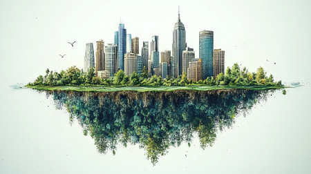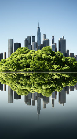 Lush trees surround towering skyscrapers on a floating island reflecting in calm water, creating a serene view.