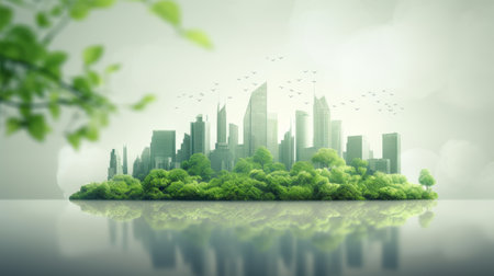 A futuristic cityscape blends with lush greenery, symbolizing sustainable urban living. AIG41