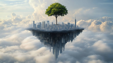 This digital artwork presents a striking contrast between urban and natural landscapes, featuring floating islands with a tree and cityscape. The surreal reflection in water enhances the sense of balance and harmony, inviting viewers to explore themes of modern life versus nature.