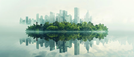 Urban skyline shrouded in mist, surrounded by lush trees, illustrates the harmonious balance between city life and nature in this stunning landscape