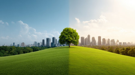A striking visual representation shows the juxtaposition of lush green landscapes with urban skyscrapers, emphasizing the relationship between nature and city life.