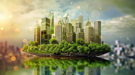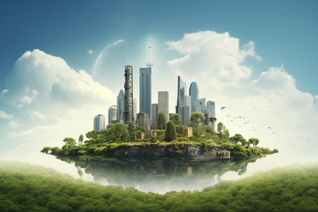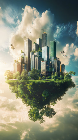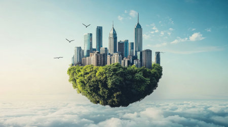 Conceptual image of a modern cityscape on a floating island with natural landscape against a dreamy sky