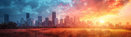Urban skyscraper skyline vs rural countryside at sunset, highlighting the contrast between city and nature