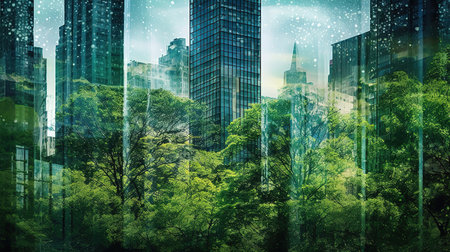 Green city double exposure of lush green forest and modern skyscrapers. Generative ai