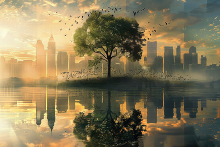 City skyline merges with a vibrant natural landscape. Trees and mountains are reflected in a calm lake.