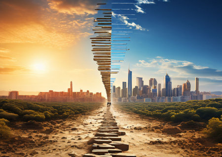 Contrasting cityscape and landscape divide, urban-nature harmony. generated by ai