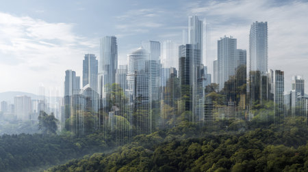Futuristic city skyline modern architecture glass skyscraper urban forest green city misty morning sustainable design nature fusion skyline high