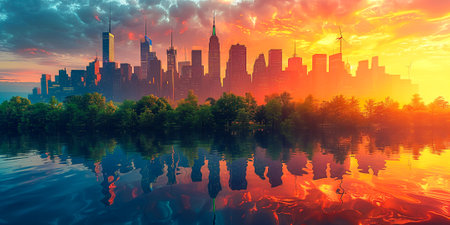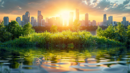 A breathtaking urban scene showcasing a modern skyline with vibrant greenery and reflections in a tranquil body of water during golden hour.