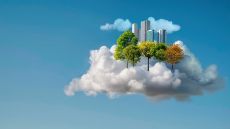 This captivating visual features a harmonious blend of urban architecture and lush greenery, floating gracefully above a serene cloudscape, evoking a sense of tranquility and innovation.