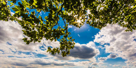Tree branches with green leaves and blue sky with white clouds background.