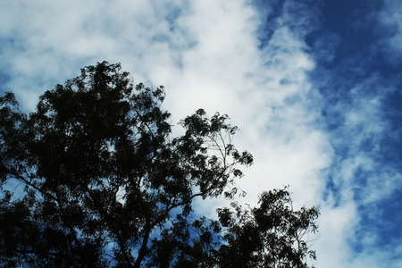 The blue sky is naturally sunny on white clouds in bright weather atop the green trees. (3)