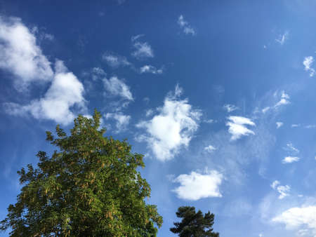 Deciduous trees and ship pines against a beautiful sky with clouds on a hot summer day
