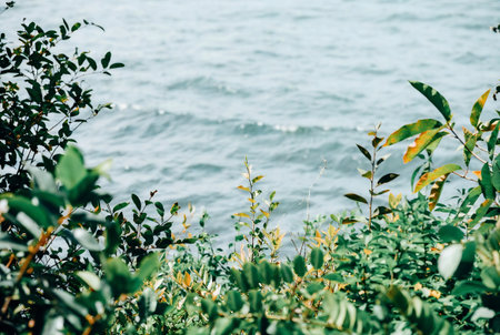 Beautiful nature view of the sea and green leaves in summer.