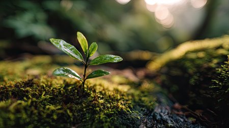 Photo of a young plant growing on moss at sunrise, symbolizing hope and new beginnings.