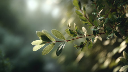 The Agarwood in spring, fresh green leaves, soft sunlight filtering, vibrant atmosphere full of vitality, natural textures, serene mood.