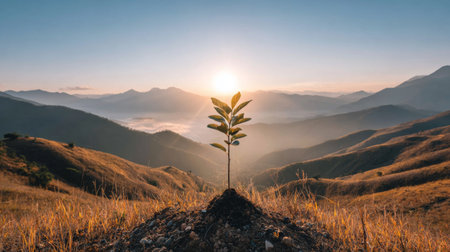 A young sapling stands tall on a mountainside, basking in the warm glow of a sunrise. This serene landscape captures the essence of hope and renewal in nature.