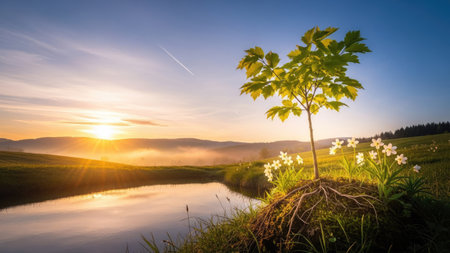 A small tree with green leaves and white flowers sits on a small mound beside a tranquil river. The scene is bathed in the warm light of a setting sun, with soft colors in the sky and water. This image could be used for various purposes, including articles about nature and landscape design.