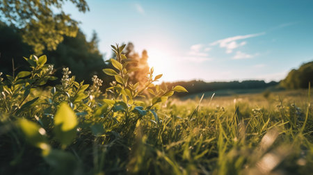 Golden sunlight illuminates tall grass swaying gently in a peaceful meadow during late afternoon creating a calm and warm atmosphere.