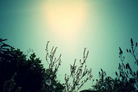 Beautiful summer landscape with sun rays and bokeh effect.