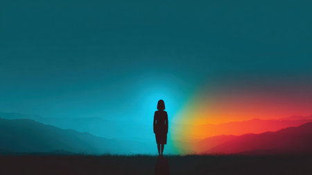 A person gazes at a vibrant horizon where colors merge, showcasing mountains and an expansive sky during dusk or dawn.