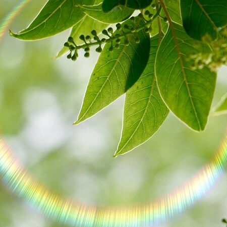 Young green leaves of a birch tree in the foreground in the sunlight and an inverted rainbow reflection.