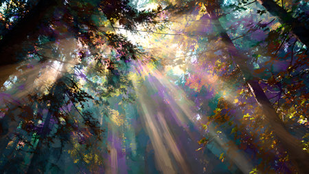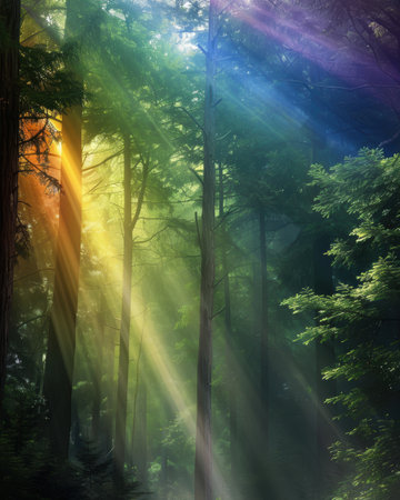 Iridescent light rays creating vibrant patterns among forest trees in natural setting