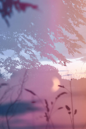 Bright cosmic elements overlay texture with vibrant foliage details in a serene atmosphere