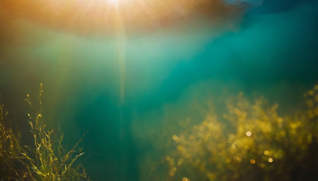 spring bokeh abstract blurred yellow cyan background, sun glare background. High quality photo