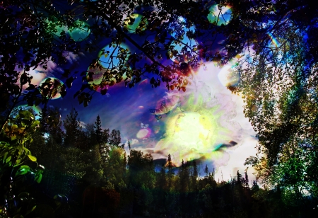 Fantasy scene with surreal light and colors in nature created by overlaying photographic elements.