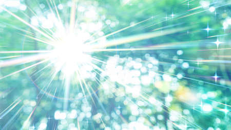 Beautiful Nature Blurred Background. Green Bokeh. Summer or spring backdrop with fresh green leaves and sun flares