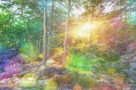 Magical forest with sunlight beams