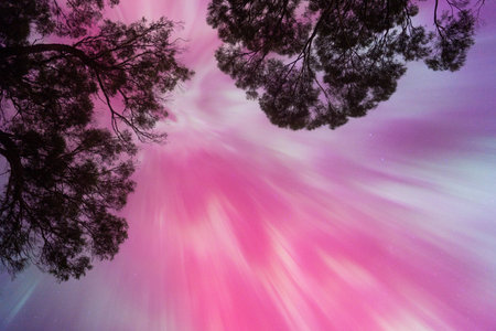 Colorful aurora borealis glowing over a snowy pine forest, creating a magical night landscape.
