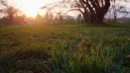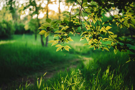 Peaceful landscape sun in the forest and meadow sunset. Fresh green grass closeup, blurred trees warm sunlight foliage. Idyllic nature template. Nature backdrop. Beautiful meadow