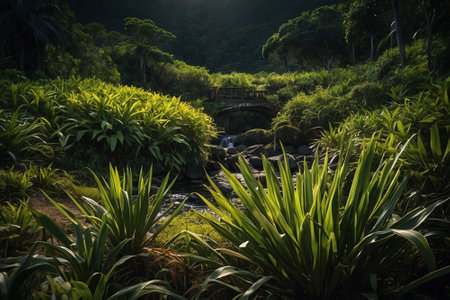 the tropical landscape unfolds with a stunning junction of fresh green foliage, blooming flowers, and colorful hues, set against a backdrop of white sandy shores, showcasing the beauty of a tropical paradise, captured with professional photography skills on unsplash. ai generated