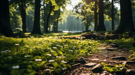 A beautiful summer scene - the warm sunlight shines through the verdant foliage of tall trees, casting long shadows on the lush grass.