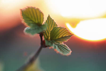 spring evening forest through which the setting sun peeks, illuminating a tree branch with young leaves