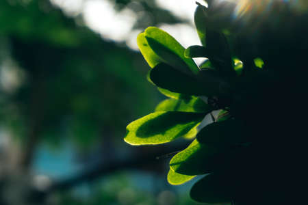 Selective focus closed up tropical summer green leaf dark tone background