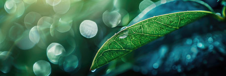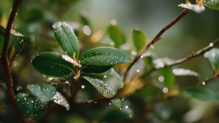 A close-up shot capturing fresh green leaves adorned with glimmering water droplets, creating a serene and vibrant atmosphere ideal for nature lovers and enthusiasts.