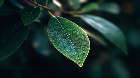 Lush Green Leaves with Intricate Veins Stand Out Against a Dark Background in a Dense Forest Scene