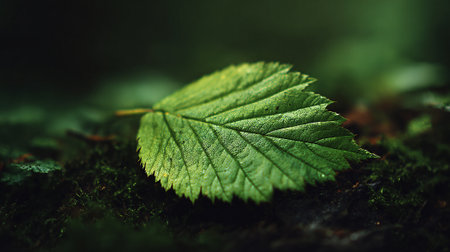 A green leaf rests gracefully on a bed of mossy earth.