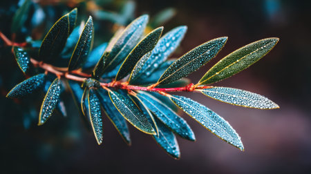 A serene close-up of dew-covered leaves on a branch, set against a soft focus background. This image captures the beauty and tranquility of nature in a lush environment.