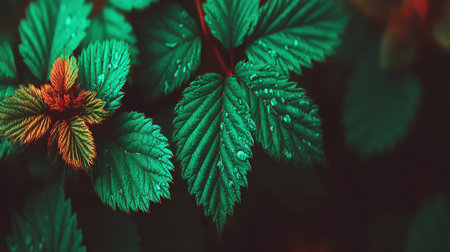 A macro photograph of lush green plant leaves covered in tiny water droplets. A small new leaf shows hints of red and orange against a dark, atmospheric background.