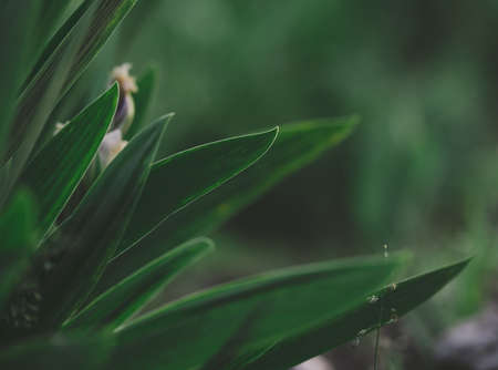 rain drops in close-up on the green leaves of the plant