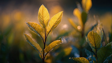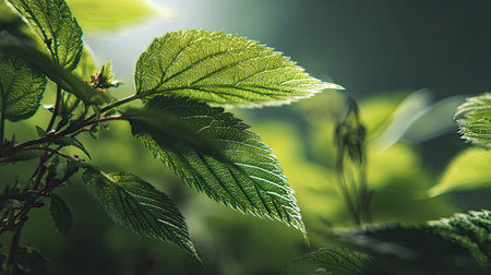 A close-up shot of illuminated green leaves with soft, natural lighting, creating a serene and peaceful atmosphere in a nature-inspired setting.