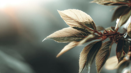 Captivating close-up view of delicate green and brown leaves with a soft focus background, showcasing nature's calm beauty and serene atmosphere in sunlight.