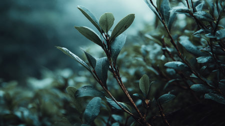 This close-up image features dew-covered leaves amidst a foggy atmosphere, creating a serene and tranquil setting ideal for nature-themed projects.